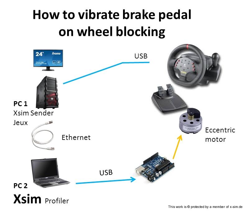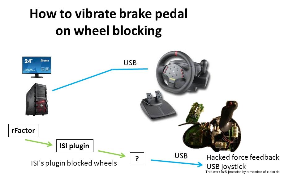 A commercial product does this : the Fanatec CSP V2 (motor + plugin). When the wheels are blocked, a motor is vibrating.