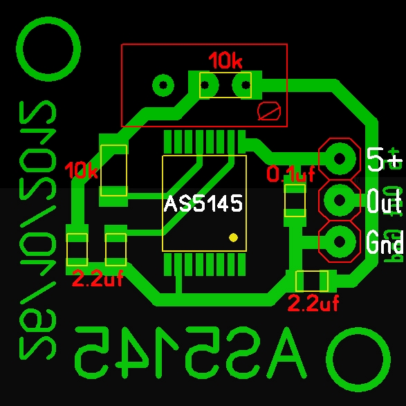 I have a pcb for the AS5145 chip, it uses 1206 smd resistors and 0805 smd capacitors. The 10k resistor can be substituted for a 10K multiturn resistor like the AMC board if you want it adjustable. The PCB is 25mm square, I also have a 20mm square version as well.