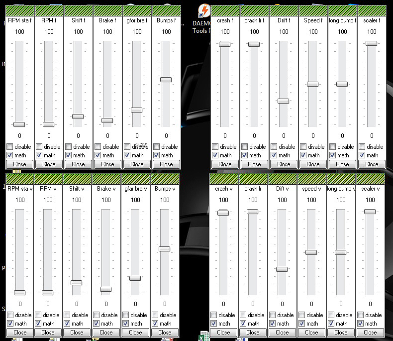On the profiles I found, one thing in common, two outputs, BassShaker frequency and volume. Then some axis, one profile has only two, the other has a bunch of them, sim data related, like RPM, speed, brake, bumps, etc. This looks more like what I'm looking for! They present themselves in form of sliders, which makes me think moving the slider up and down has effect on the intensity of each of these parameters. But I still haven't found how to open and edit each of the parameters, how to create new ones, nor for that matter to fully understand what they stand for, since only the first characters of the name appear on the slider (see attached screen capture). In which part of the extractor can I see in detail these effects, individually.