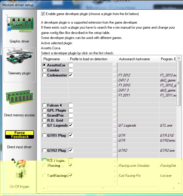 Possiedo una pedana 3dof della Giantruck, ho installato diversi games che hanno funzionato (anche se con qualche problema iniziale) e adesso ho installato assettocorsa STEAM ma la pedana non si muove assolutamente. Ho tentato di ricevere un loro supporto tecnico ma non ho ricevuto nessuna risposta.