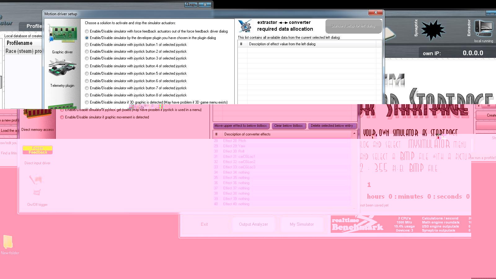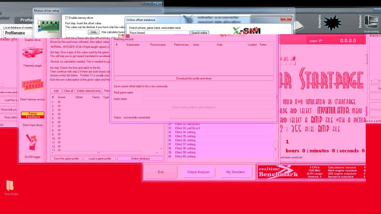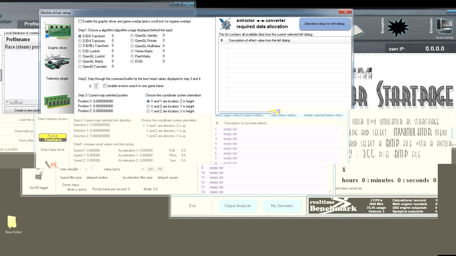 These tutorials are extremely important and excellent in content , ( Please forgive my ignorance ) however there is a lot of setup and profile and configuration information and I think it depends upon how a person`s perception is regarding how a person starts and advances through one`s project ,the outcome of the final result can either be very frustrating ,or it all comes together and not many problems are experienced .However ( although very technical myself ) this has not been the case for me .Everything I tried in setting up the software ,the profiles and trying to get the system working proved futile ,and once I started getting motors turning That is all they done ,they did not stop .Going back ,and checking ,feedbacks ,motor outputs ,percentages using the k8055 demo software ,x-sim software etc,this was all happening ,so why did I not get the results I have set out to achieve .