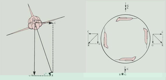 Cuando un móvil, como el avión, se desplaza en el espacio de tres dimensiones, se ve sometido a unas fuerzas debidas a las aceleraciones y fuerzas centrífugas.
